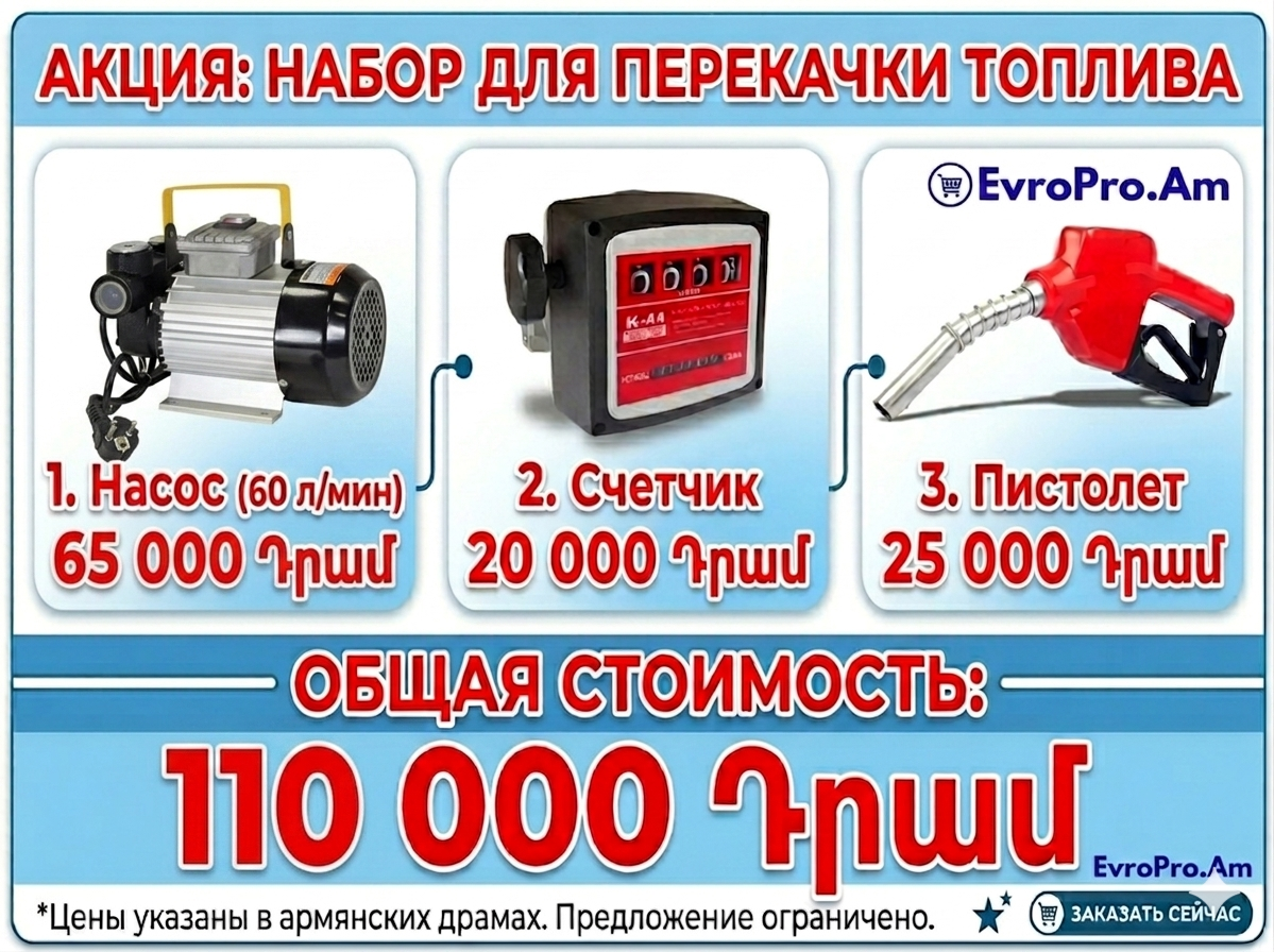 Եթե ցանկանում եք կազմակերպել ձեր սեփական փոքր լցակայանը, ավտոպարկի վառելիքաբաշխման կետը կամ բարելավել գործող համակարգը՝ օգտագործելով դիզվառելիքի պոմպեր, բենզինի պոմպեր, դիզվառելիքի հավաքածուներ, բենզինի հավաքածուներ, ավտոմատացված սյուներ, Եվրակուբ-Լցակայան, վառելիքի հաշվիչներ, ատրճանակներ, վառելիքի ֆիլտրեր, կծիկներ և յուղի պոմպեր, ապա EvroPro.am-ը ճիշտ ընտրություն է։