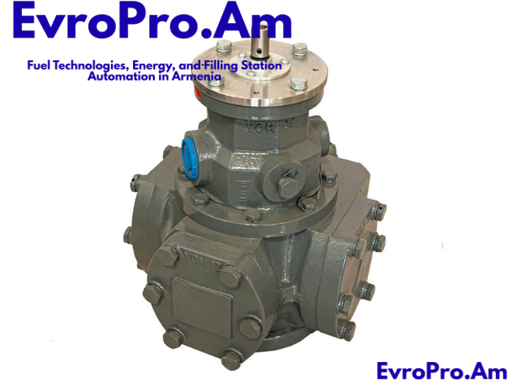 The meter is equipped with four working cylinders. The inlet is located at the top of the measuring chamber and the outlet at the bottom. The device converts the volume of dispensed fuel into the angular rotation of the output shaft, which is then used for mechanical or electronic registration and billing.